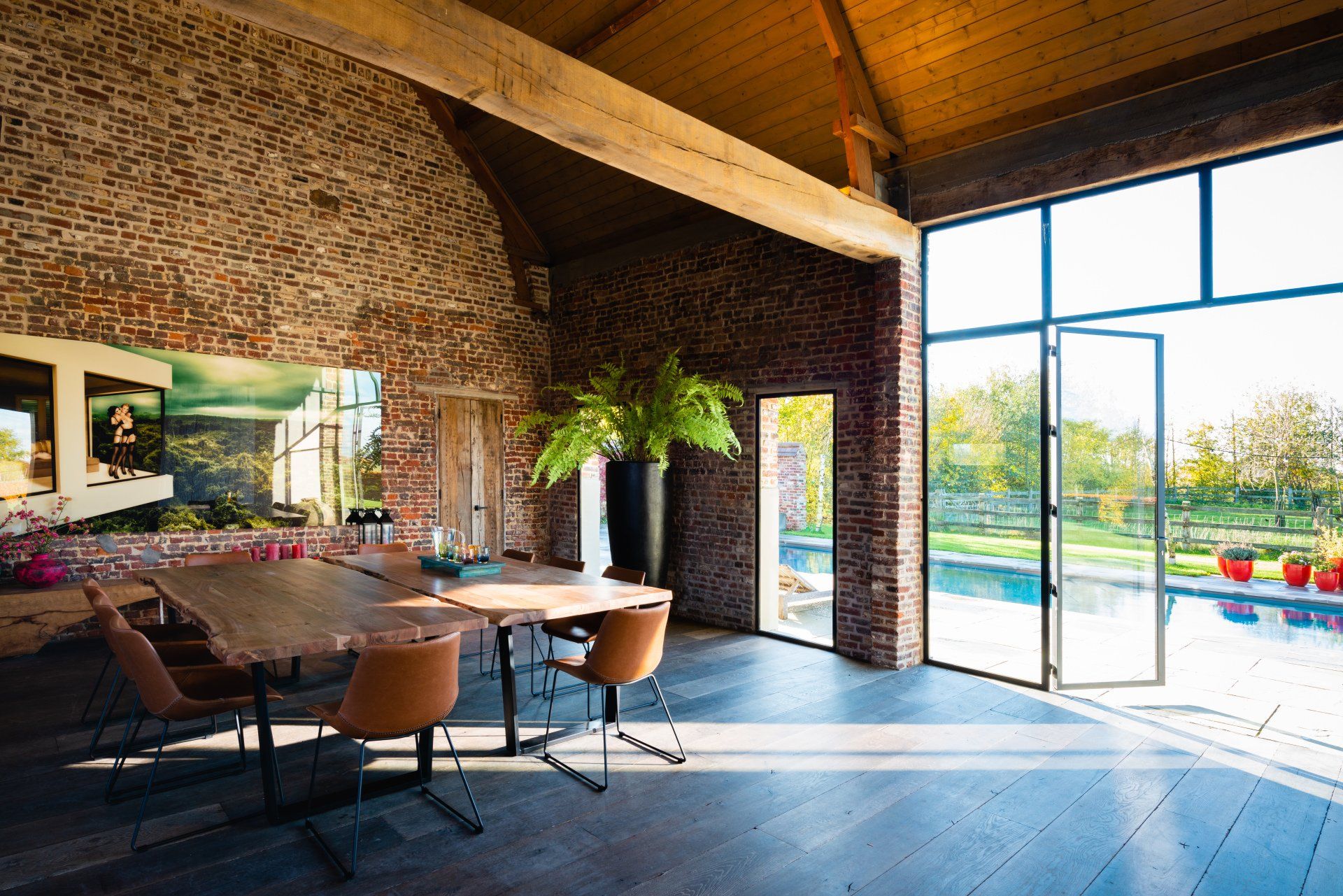 De verschillende ruimtes sluiten op elkaar aan en lopen in elkaar over. Sommige daarvan geven uit op de rustgevende tuin. Het rondom rond liggende groen en de speelse lichtinval zorgen voor het ideale kader om sterk te focussen, een goed gesprek te hebben of geïnspireerd te worden tot creatieve ideeën.