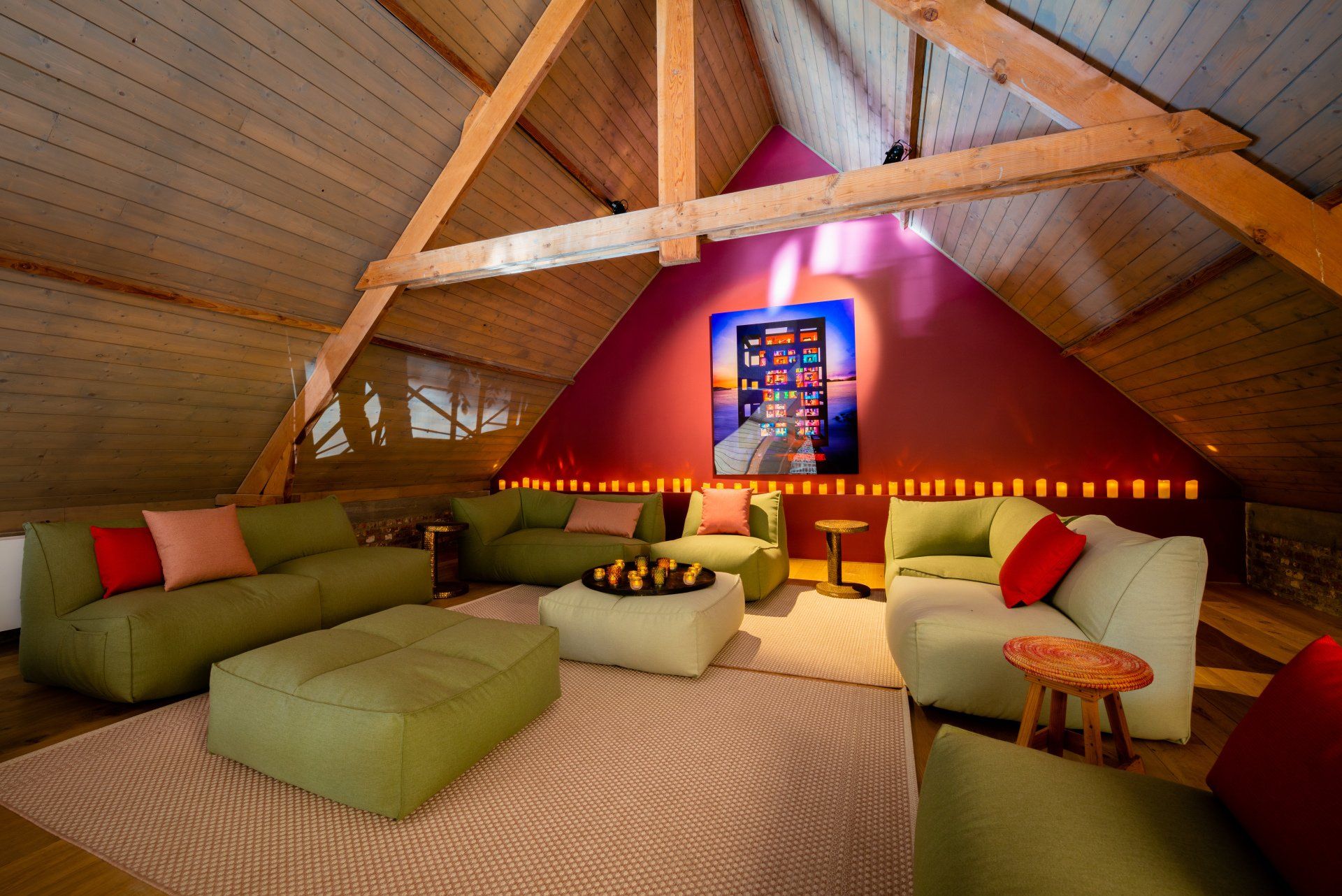 Verscheidene opties en combinaties zijn mogelijk, die werken we graag op maat voor u uit. We bieden twee grote tafels aan waaraan vergaderd of gegeten kan worden. Maar deze kunnen even makkelijk weggenomen worden waardoor een receptie of andere staande formule mogelijk wordt. In de open keuken kunnen bijvoorbeeld broodjes of een lichte maaltijd gegeten worden. Het is ook mogelijk om er iets op te warmen.